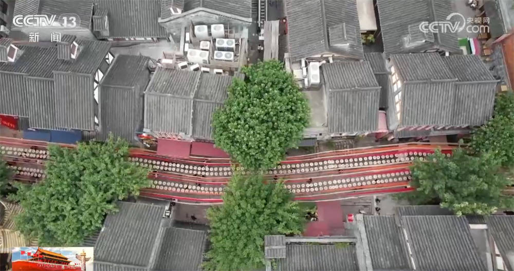 r这里是位于重庆市渝中区的十八梯传统风貌区。国庆假期,十八梯四百米长草帽长街上空挂起流动的红色长纱,各处还挂上了鲜艳的五星红旗,整条街被“中国红”点亮,传递着浓厚的家国情怀。